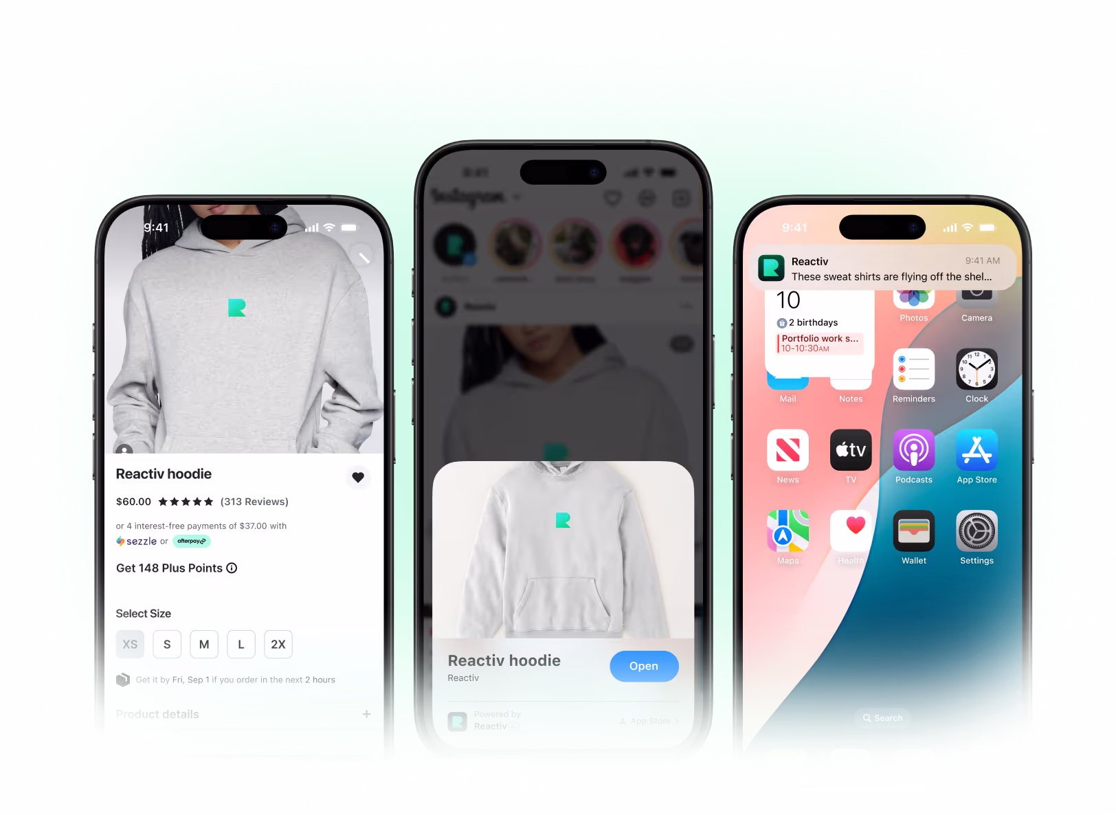 Start with a Reactiv Clip, seal the deal with your app. Customize product pages, collections, and branding with modular React components.
